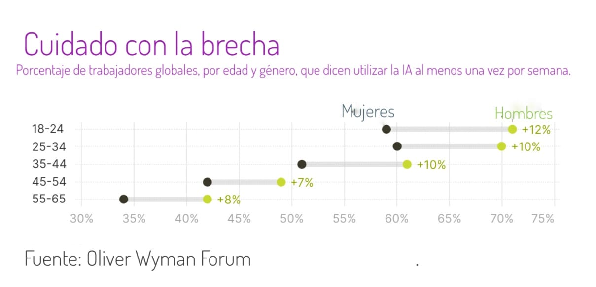 La IA generativa se está convirtiendo en una nueva industria en sí misma y las mujeres no se están mostrando tan dispuestas como los hombres a adoptarla. Según una investigación reciente realizada por el Foro Oliver Wyman entre 25.000 trabajadores adultos encuestados, el 59% de los trabajadores varones de entre 18 y 65 años de todo el mundo afirman utilizar herramientas de IA generativa al menos una vez a la semana, mientras que sólo el 51% de las mujeres dicen lo mismo. Son disparidades que se manifiestan en todos los grupos de edad y en las 16 zonas geográficas estudiadas. Aunque lo más preocupante es que la brecha de género es mayor entre los trabajadores más jóvenes: el 71% de los hombres de entre 18 y 24 años afirma utilizar IA generativa semanalmente, frente al 59% de las mujeres: